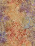 Watercolor Sunshine collection by Anthology. Pink petal shapes on marigold. 100% cotton batik fabric, 42-45in wide.