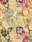Aloha collection by Moda. Abstract flowers and leaves in grey-green, moss, amethyst, orange, cerise, and purple. 100% cotton batik fabric. 42-45in wide.